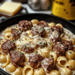 - Remettez les pâtes coquilles égouttées et le bœuf haché réservé dans la poêle contenant la sauce crémeuse.